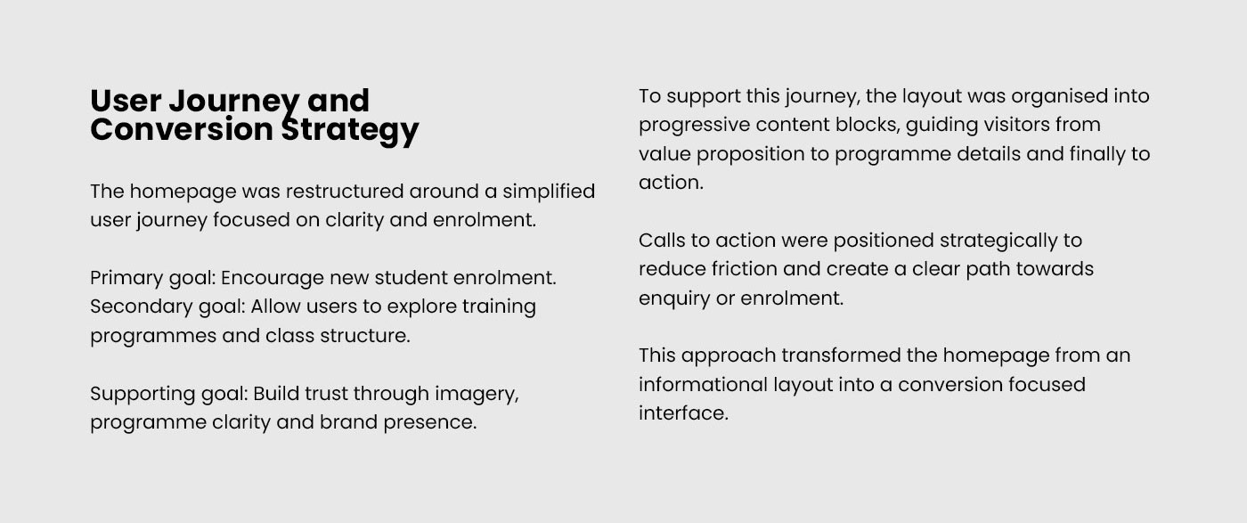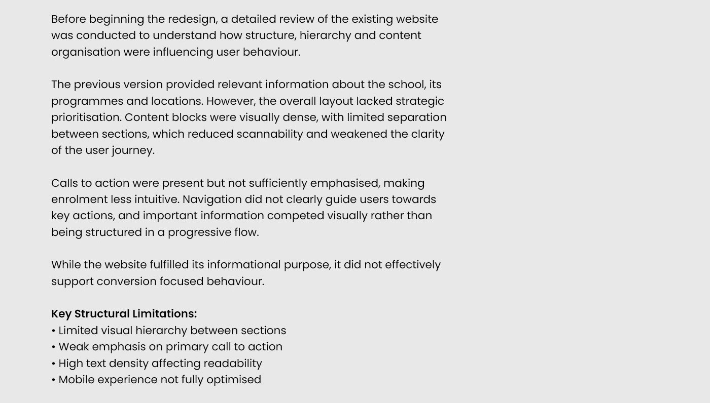 Challenge: The previous website lacked clear hierarchy, strong calls to action and a conversion oriented layout. The user journey required simplification and better structural organisation.