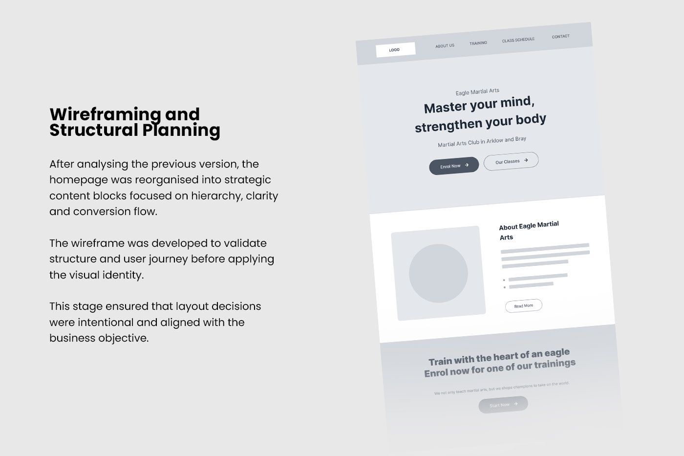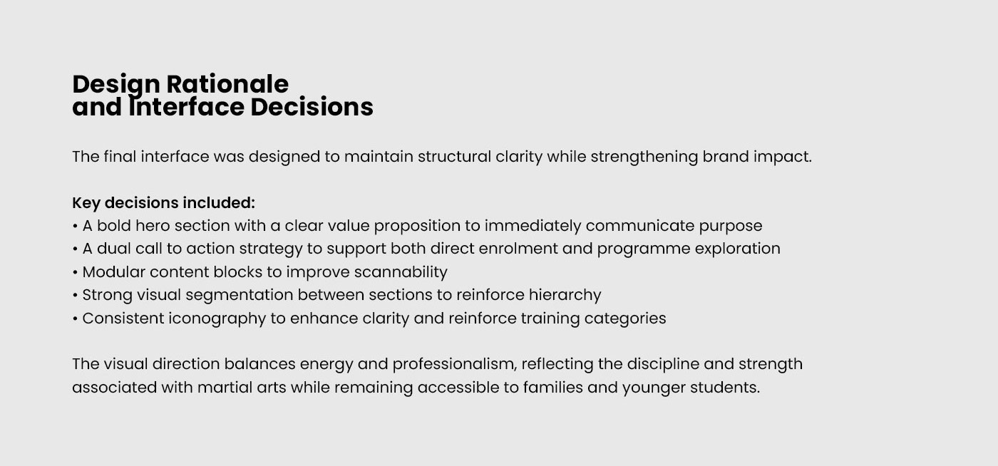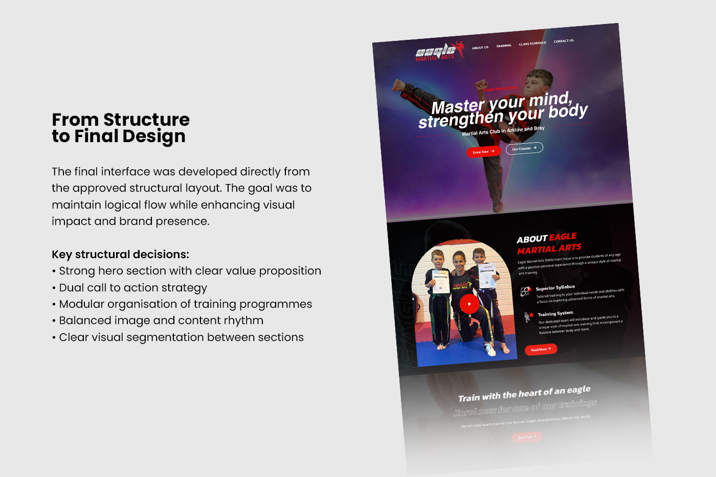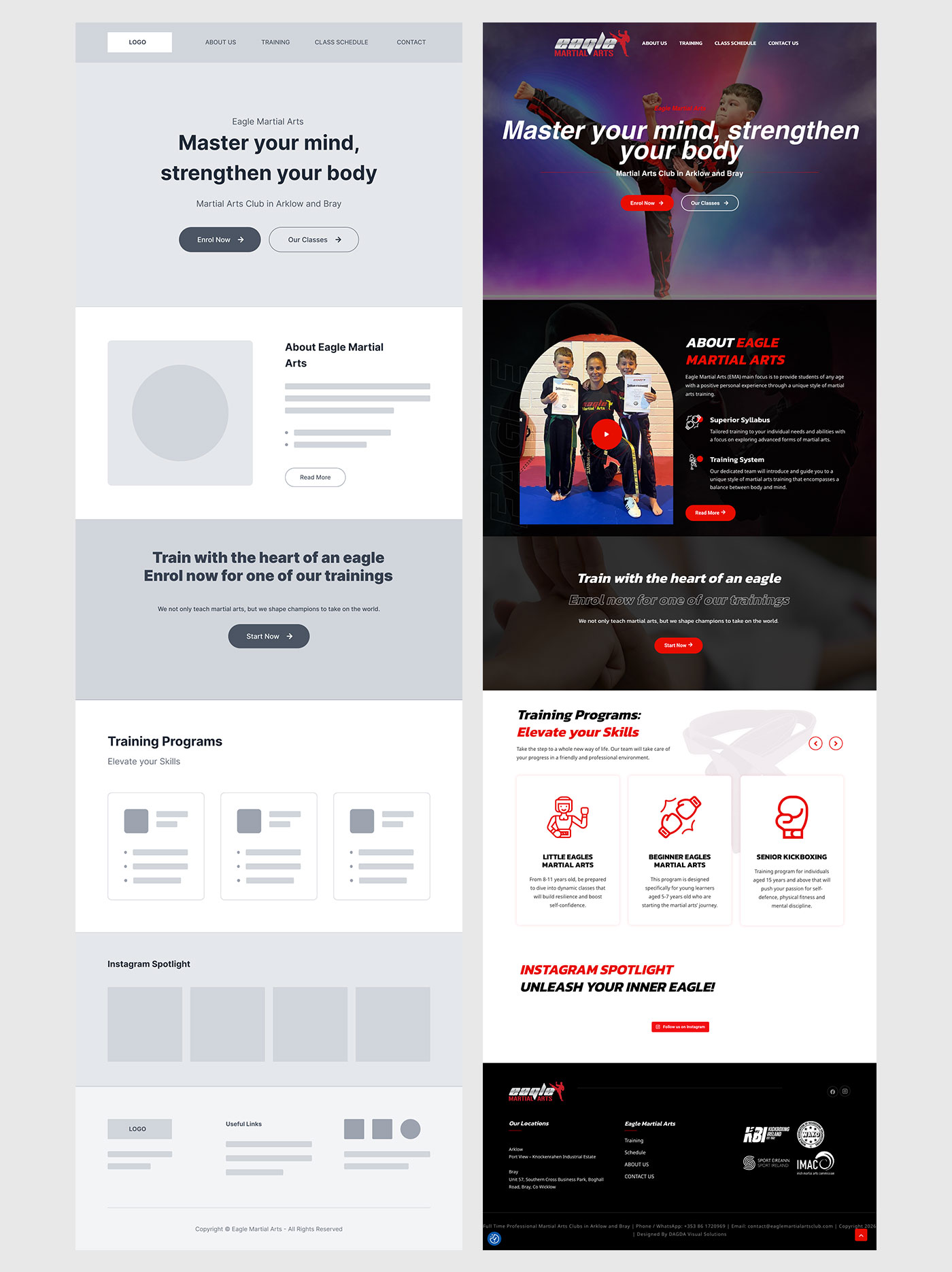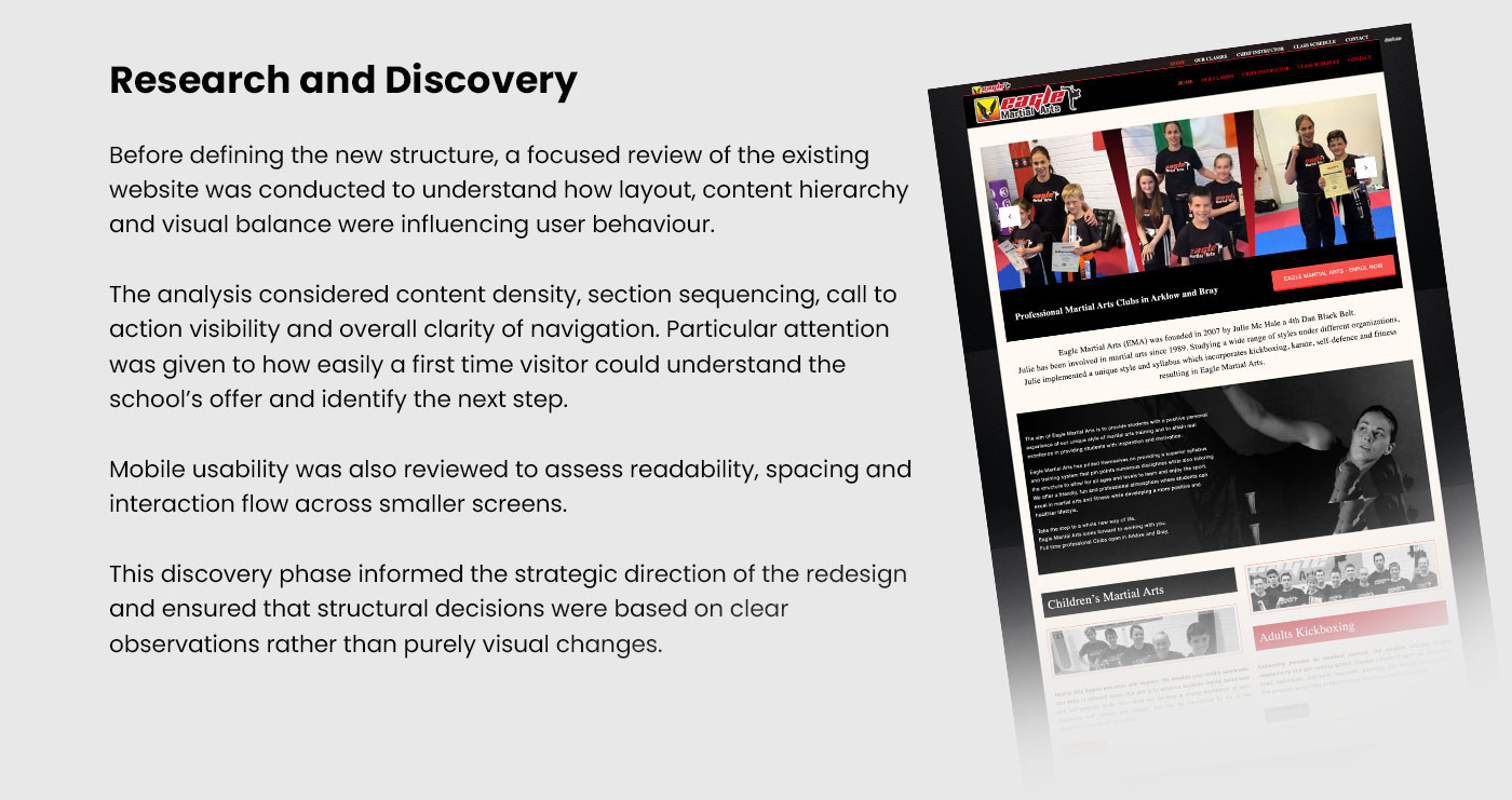 Eagle Martial Arts is a martial arts school based in Arklow and Bray, Ireland. The project aimed to modernise the brand’s digital presence and transform the website into a more effective enrolment tool.